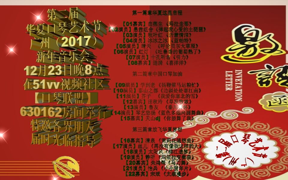 主辦方:第二屆華夏口琴藝術(shù)節(jié)組委會(huì) 江蘇東方樂器有限公司 VV視頻社區(qū)綜合教育專區(qū) 時(shí)間:2016年12月23號20::00 12月30號20:00(二場) 地點(diǎn):VV娛樂社區(qū)---綜合教育專區(qū)---在線教育---口琴聯(lián)盟630162房間 VV視頻社區(qū)下載地址: VV娛樂社區(qū)http://www.51vv.com/soft/soft_vv.shtml 手機(jī)下載地址: VV手機(jī)http://www.51vv.com/51vvm/share/sharepc/beta.html 23號節(jié)目單 篇章華夏這里啟程 【01嘉賓】白燕生 《瑪拉圭那》 【02演員】愚翁組合《彈起我心愛的土琵琶》 【03演員】秋葉紅 《沂蒙情深》 【04演員】冰冰之冰 《藍(lán)帕特》 【05演員】晴天 《呼倫貝爾大草原》 【06演員】紅燈 《吐魯番的葡萄熟了》 【07演員】十孔聽者《引力》 【08嘉賓】漣漪 《喜洋洋》