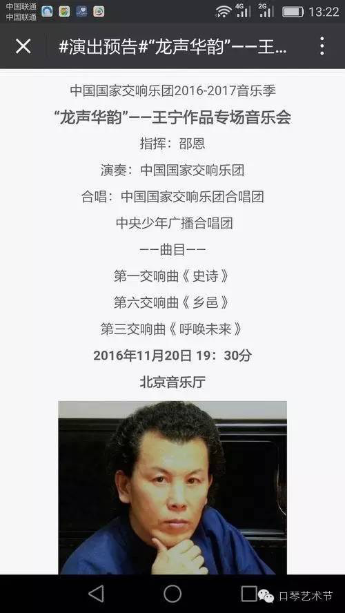 那是在2016年11月19日的早上7:30,我被電話聲吵醒。這是周六。電話里傳來(lái)急促而熟悉的曾在中國(guó)文聯(lián)工作過(guò)的林大姐的聲音,她讓我趕緊起床,10:00去中國(guó)交響樂(lè)團(tuán)排練,有一個(gè)交響曲需要口琴,明天晚上要在北京音樂(lè)廳正式演出。我當(dāng)時(shí)還在睡夢(mèng)中,迷迷糊糊的,以為她跟我開(kāi)玩笑呢!可她接著問(wèn)我?guī)c(diǎn)去接她,我才猛然意識(shí)到這是真的了……我飛快地洗刷完畢,匆匆忙忙準(zhǔn)備口琴。由于林大姐沒(méi)告訴我用啥口琴,啥調(diào)的,我只好帶著一套“東方鼎”套琴及一只半音階口琴趕往中國(guó)交響樂(lè)團(tuán)排練廳。在路上我跟林大姐說(shuō),我很忐忑,我經(jīng)常跟口琴團(tuán)隊(duì)演出或者跟錄音伴奏吹,但從來(lái)沒(méi)跟這么的交響樂(lè)團(tuán)一起演奏過(guò),吹什么旋律,多大難度我都不知道,我會(huì)很緊張的。她說(shuō)以前聽(tīng)過(guò)我的口琴演奏,覺(jué)得肯定能勝任。