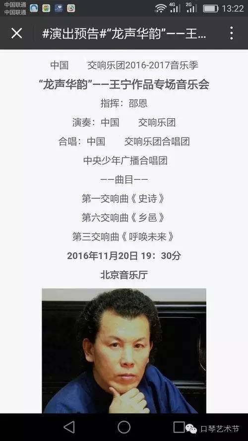 那是在2016年11月19日的早上7:30,我被電話聲吵醒。這是周六。電話里傳來急促而熟悉的曾在中國文聯(lián)工作過的林大姐的聲音,她讓我趕緊起床,10:00去中國交響樂團(tuán)排練,有一個(gè)交響曲需要口琴,明天晚上要在北京音樂廳正式演出。我當(dāng)時(shí)還在睡夢中,迷迷糊糊的,以為她跟我開玩笑呢!可她接著問我?guī)c(diǎn)去接她,我才猛然意識(shí)到這是真的了……我飛快地洗刷完畢,匆匆忙忙準(zhǔn)備口琴。由于林大姐沒告訴我用啥口琴,啥調(diào)的,我只好帶著一套“東方鼎”套琴及一只半音階口琴趕往中國交響樂團(tuán)排練廳。在路上我跟林大姐說,我很忐忑,我經(jīng)常跟口琴團(tuán)隊(duì)演出或者跟錄音伴奏吹,但從來沒跟這么的交響樂團(tuán)一起演奏過,吹什么旋律,多大難度我都不知道,我會(huì)很緊張的。她說以前聽過我的口琴演奏,覺得肯定能勝任。