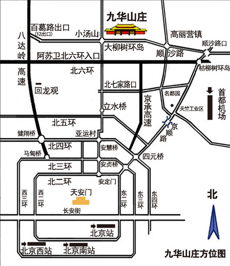 2.線路二:首都機場出航站樓(T1、 T2、 T3 )乘機場大巴回龍觀線(8線),到天通西苑一區(qū)北門園下車,(票價30元),向北步行231米,乘坐984路公交車,到九華山莊(葫蘆河站)(票價4元)