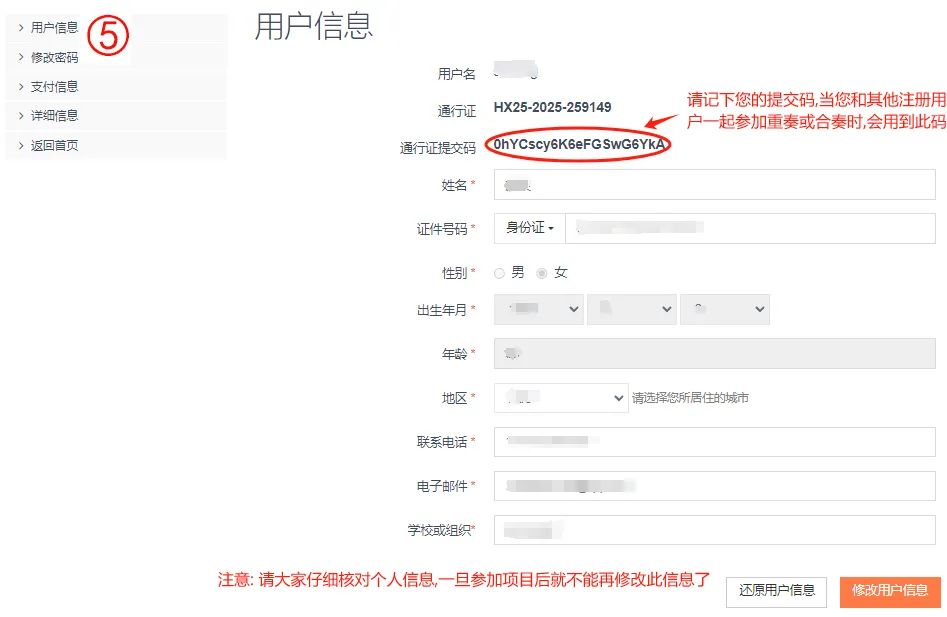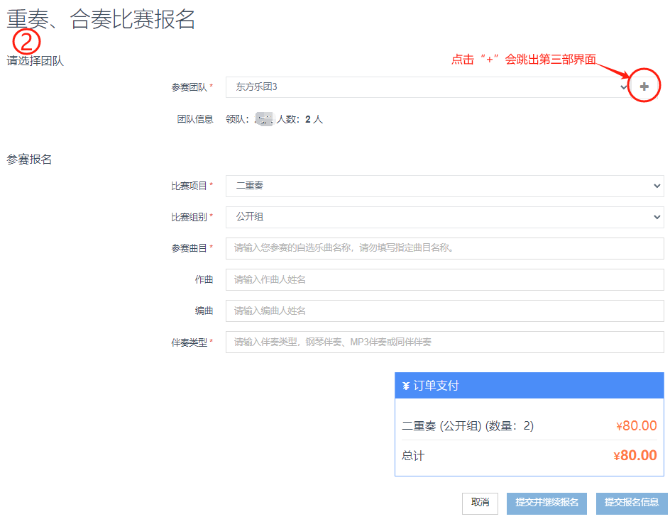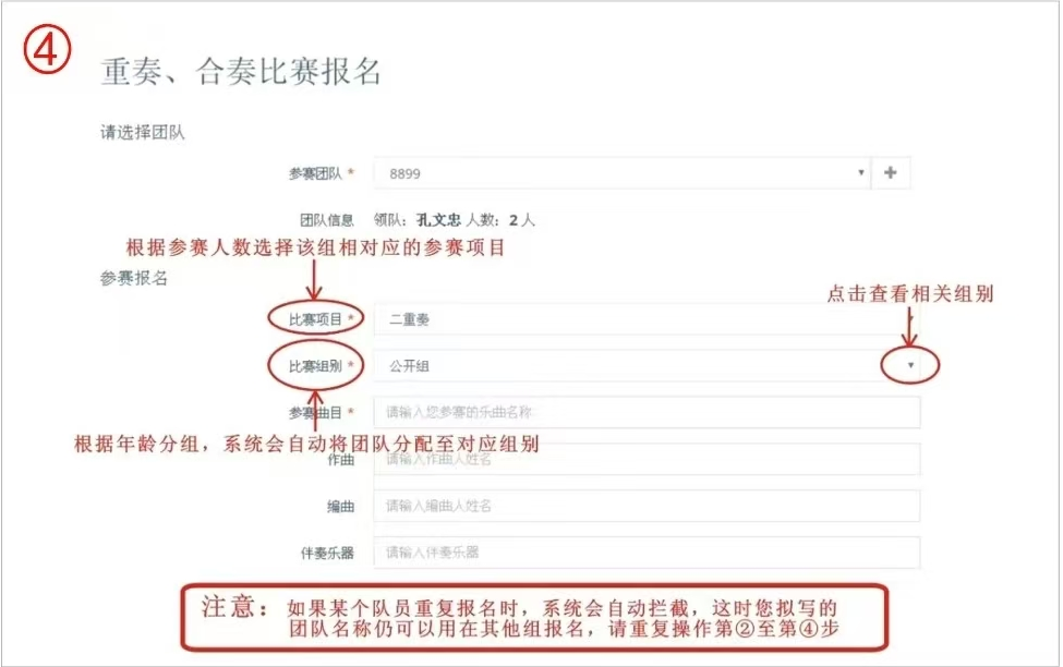 重奏、合奏報名: 第一步:重奏、合奏報名點擊“重奏、合奏” 第二步:進入重奏、合奏報名頁面,點擊 “+”,出現(xiàn)以下頁面 第三步:擬團隊名稱--選擇該組成--選擇該隊隊長,提醒:如果您需要跟其他注冊用戶組合參賽的,請在搜索框內(nèi)輸入對方的“提交碼”,點擊“搜索”按鈕,該成員會自動顯示在您的列表中。最后點擊“創(chuàng)建團隊” 第四步:請根據(jù)比賽規(guī)則選擇該組的參賽項目根據(jù)年齡分組,系統(tǒng)會自動將該組分配至對應(yīng)組別。 第五步:完成報名點擊“提交信息”,如果需要繼續(xù)報名,點擊“提交并繼續(xù)報名”