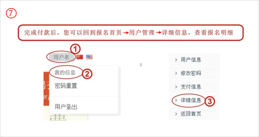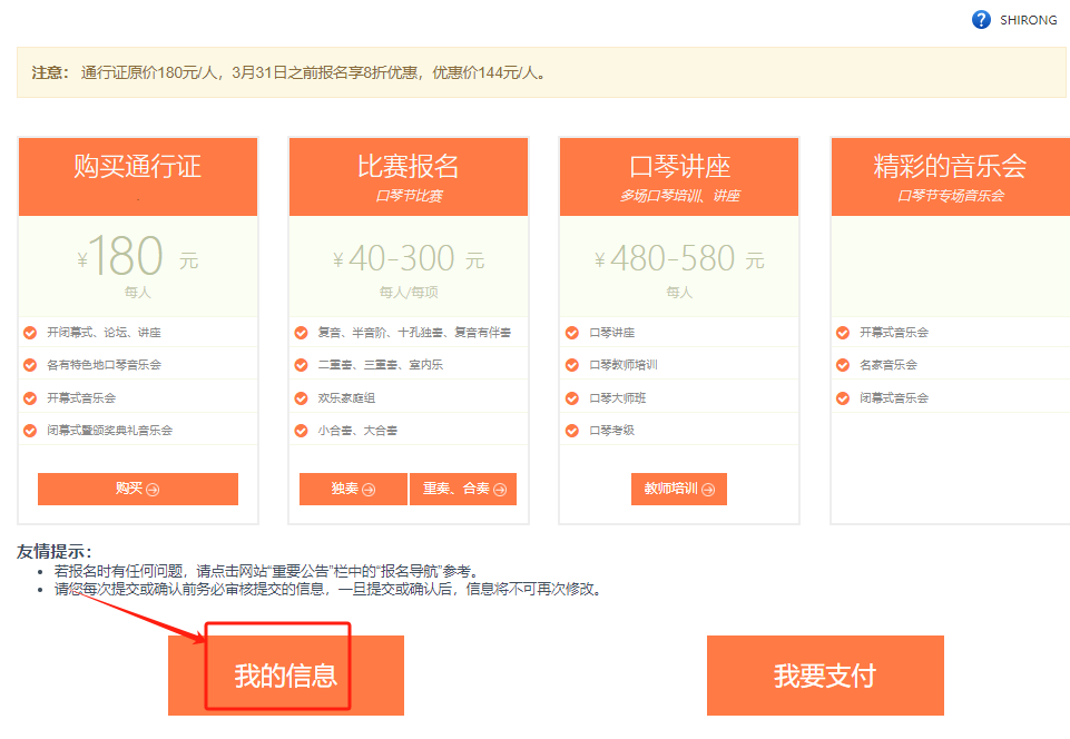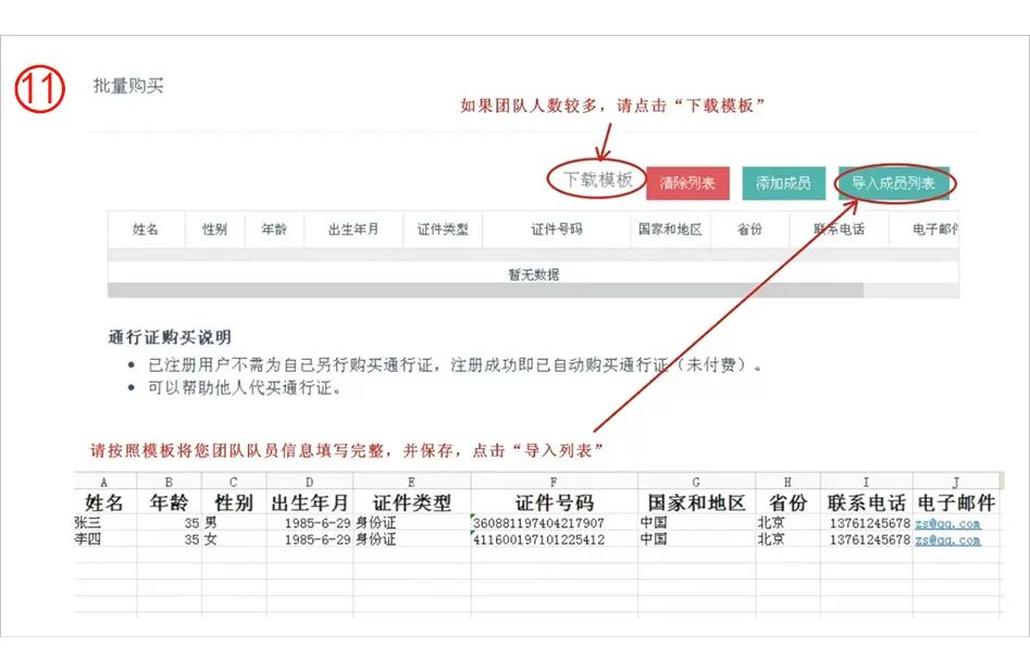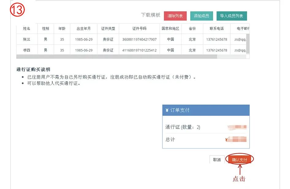 第三步:請選擇付款方式,我們提供微信支付、支付寶支付、銀行轉(zhuǎn)賬,境外可選擇中國銀行(香港)和PayPal兩個支付方式。 第四步:如選擇微信或支付寶支付請點擊相應(yīng)按鈕,掃描二維碼即可完成支付,不需再做其他操作;若選擇其他支付方式請先將您的付款截圖保存下來,再進行以下操作。 第五步:點擊“選擇文件”,選擇你使用的支付方式,確定上傳。 第六步:支付成功后,跳出提示,點擊“確定” 第七步:完成付款,回到報名首頁,點擊“用戶名”--“我的信息”--“詳細信息” 第八步:查看您的通行證。 第九步:如果您需要幫其他人購買通行證,請點擊“購買” 第十步:如果幫個人購買,您可以在“個人購買”下的表格內(nèi)輸入該成員的個人信息。檢查填入的信息,若沒有問題,則點擊“確認支付” 第十一步:如果團隊成員很多,可進入“購買通行證”在下方批量購買右側(cè)點擊“下載模板”--根據(jù)模板將您團隊所有成員的信息正確填寫,保存模板,點擊“導入成員列表”,這時您會看到所有的成員信息在網(wǎng)頁的列表中。 第十二步:如想刪除成員信息,可點擊該成員對應(yīng)的“刪除”按鈕,如想刪除所有成員,點擊“清除列表” 第十三步:如果僅僅購買通行證,核實成員信息無誤后,請點擊“確認支付”,支付請看上面第三步操作。如果還需要繼續(xù)其他報名,請先繼續(xù)其他報名,所有報名完成確認無誤后再點擊“我要支付”