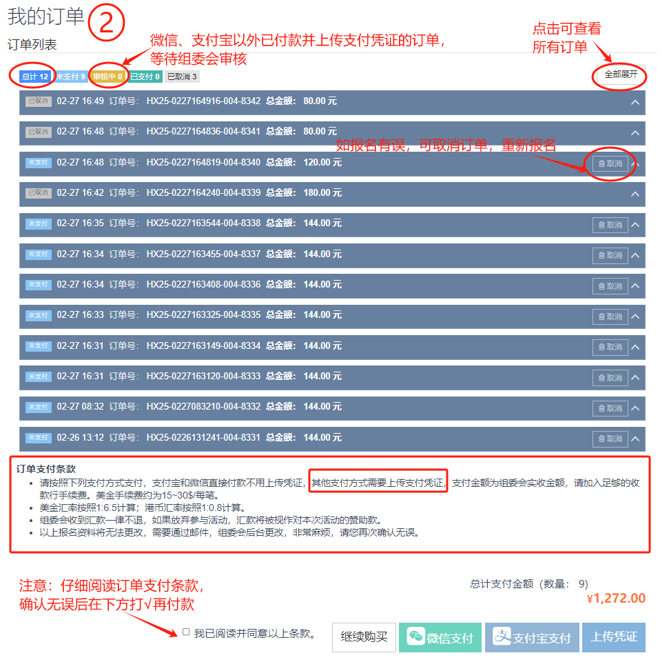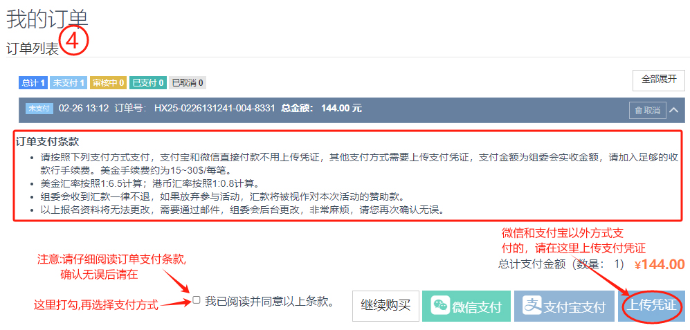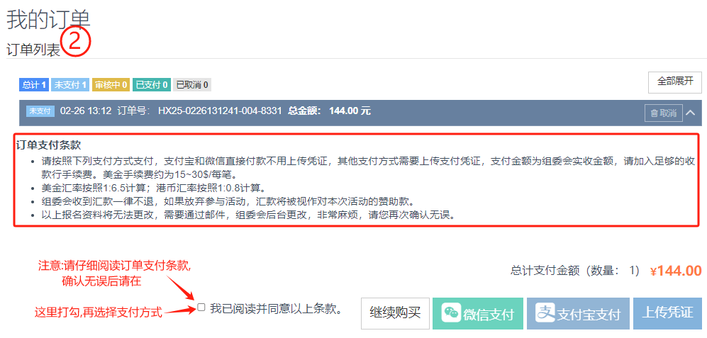 購買通行證: 第二步:仔細閱讀“訂單支付條款”,確認后打“√”。
