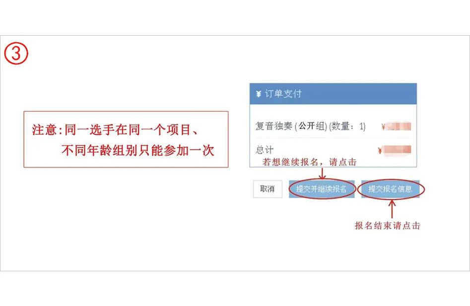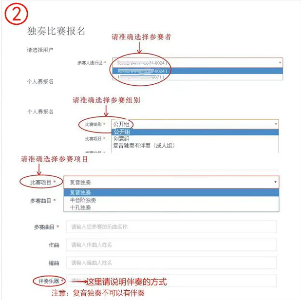 獨奏報名: 第一步:獨奏報名,點擊 “獨奏”。 第二步:按要求填寫您的獨奏報名資料。 第三步:核對資料,確認無誤后提交,提醒:同一選手在同一個項目不同年齡組別只能參加一次
