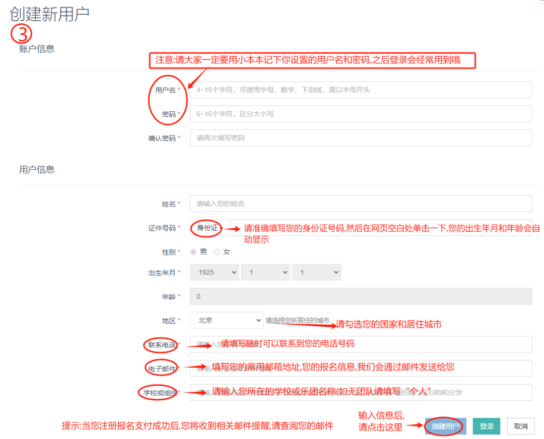 第三步:輸入您的用戶名和密碼,并用小本本記下,千萬不能忘喔!很重要!很重要!填寫您的個人信息,并且一定要仔細核對后才能點擊“創(chuàng)建用戶”。