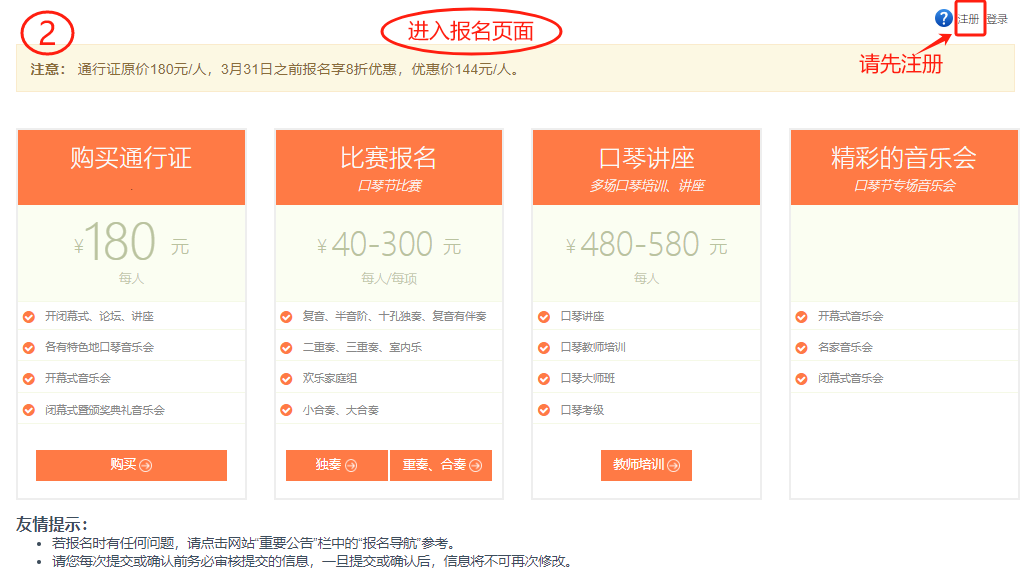 華夏口琴藝術(shù)周作為國內(nèi)規(guī)模較大的口琴活動,其發(fā)展歷程不僅見證了口琴音樂在國內(nèi)的蓬勃興起,也成為了連接全國琴友、促進口琴文化交流的重要平臺。從2015年在北京的首屆盛況,到2023年在新昌舉辦的第四屆華夏口琴藝術(shù)周吸引超過2800名參與者,每一屆都以其獨特的魅力和深遠的影響,為我國口琴藝術(shù)的推廣與發(fā)展做出了巨大貢獻。為弘揚中國口琴文化,繼續(xù)推動中國口琴音樂事業(yè)的發(fā)展,第五屆華夏口琴藝術(shù)周將于2025年7月23日~27日在福建省寧德市蕉城區(qū)舉辦! 報名時間:2025年3月1日-5月31日。 通行證180元/人,在4月1號前報名者,通行證優(yōu)惠至144元/人。更多優(yōu)惠詳情見“賽事詳情”。 注冊: 第一步:登入官方網(wǎng)站:fxzay.cn,點擊“我要報名”。 ![]() 第二步:進入報名頁面,點擊“注冊”。